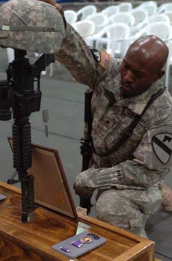 from the 3rd Brigade Combat Team, 1st Cavalry Division kneels to pay his